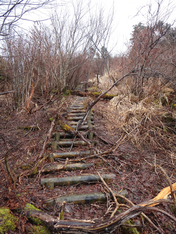 廃屋が何軒か出迎えてくれる。 廃屋の裏手から、ボロボロになった丸木の階段を登っていく。 しばらくはこの階段の地帯が続く。 階段なので、傾斜はきつめだ。
