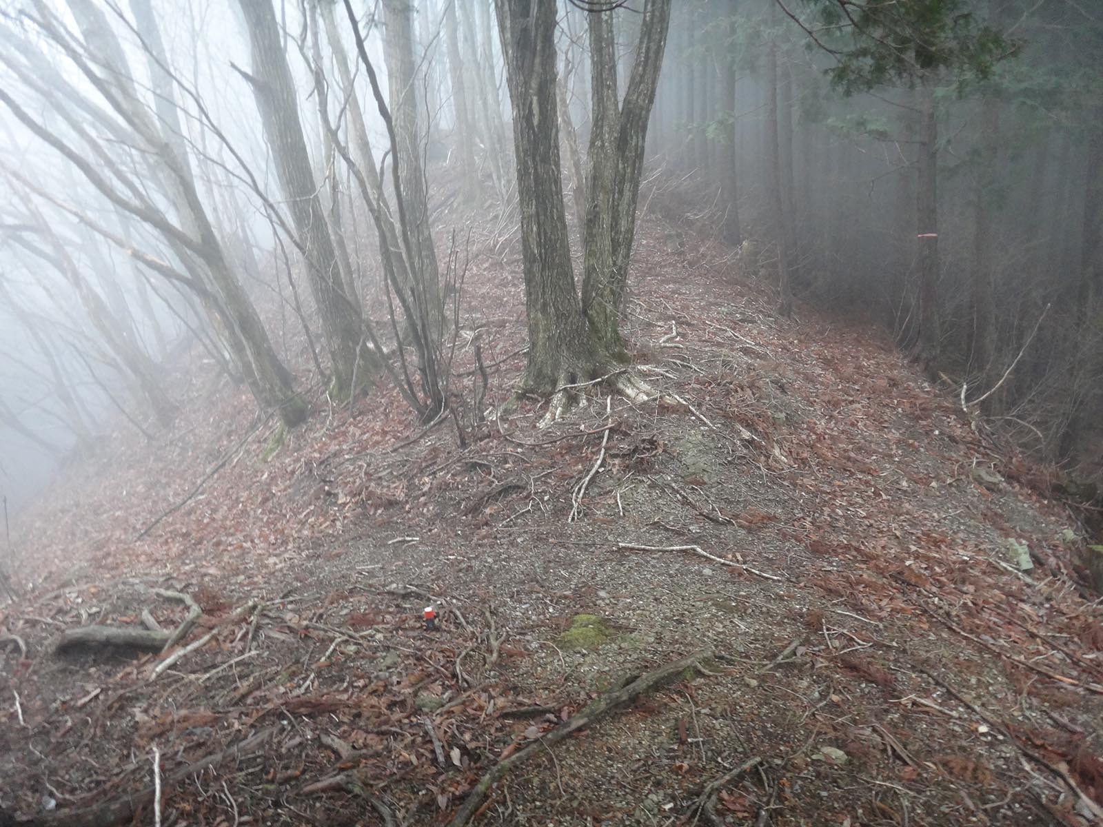 尾根道は悪い道だった。 人があまり歩かないからだろうけど、道も固まっておらず、一応赤テープはついているので道に迷うことはないのだけど。