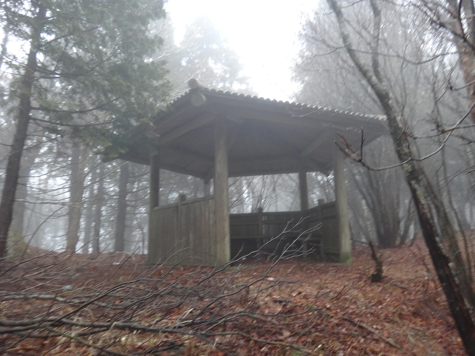 ゆっくりゆっくりと登って行く。 しばらく歩くと左手に東屋が見える。 ここは屋根があるので、多少は雨がしのげる。 先に山頂に行って、後でお昼にしよう。