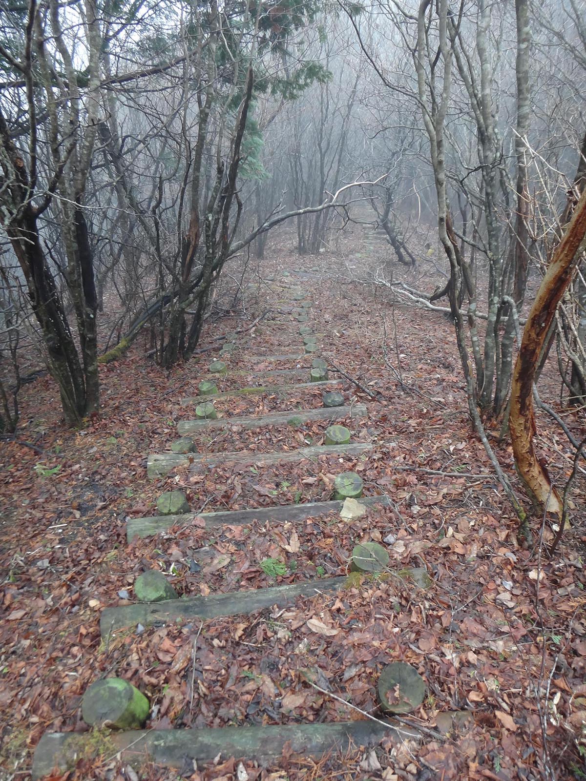 火打山からの下りはけっこう急な斜面。 木の階段があるのだが、これも滑る滑る。 ここで滑って転倒したら怪我するぞ… しかも車道までかなり遠いし携帯も圏外。 慎重に行かなくては…