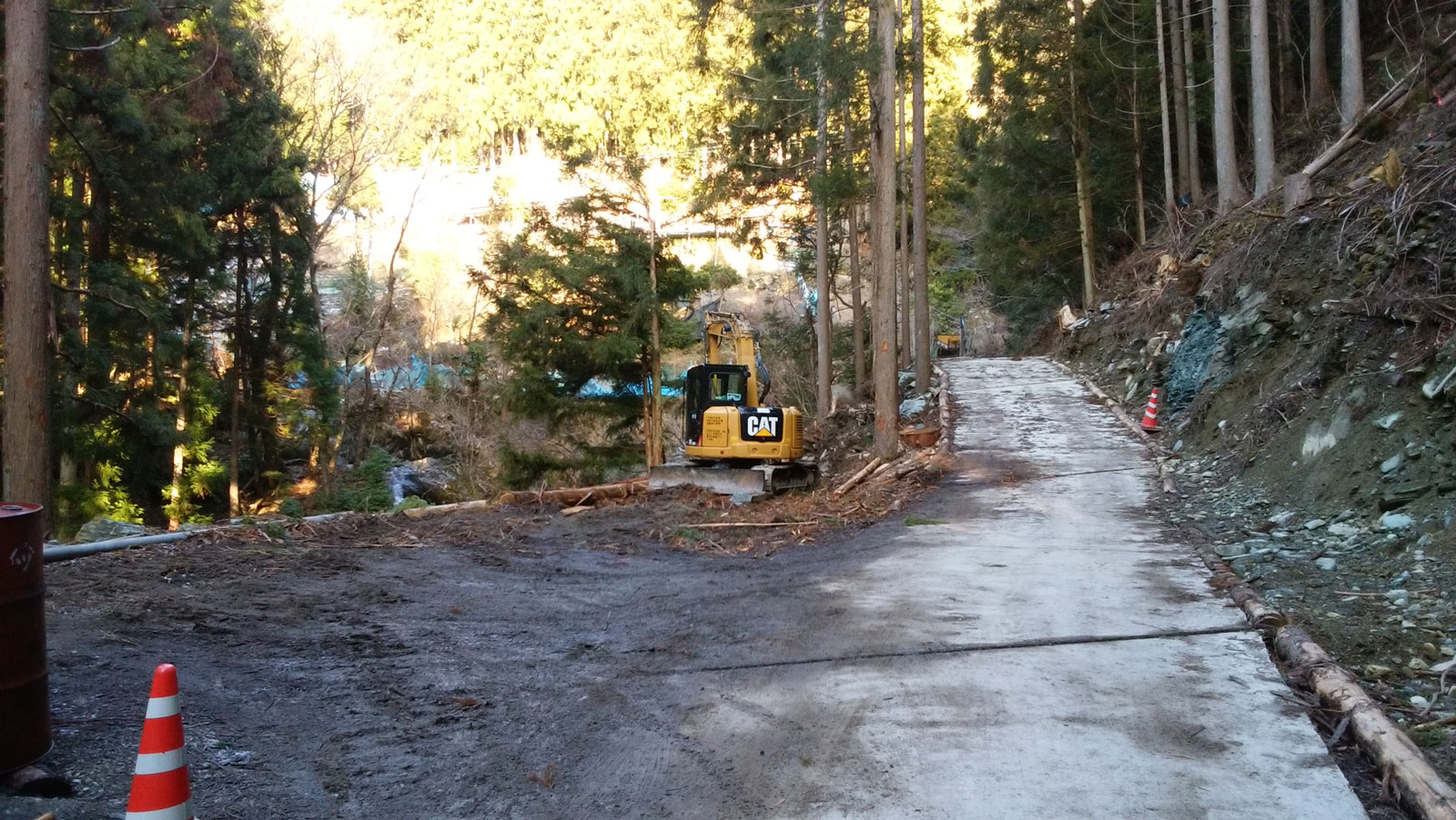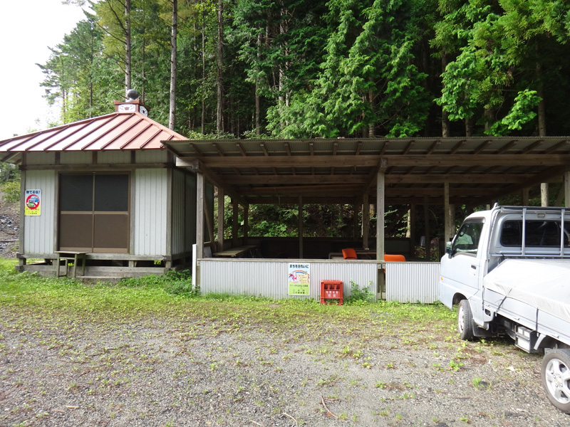 美馬ICのローソンで昼ごはんのおにぎりを購入して、黒笠山の登山口へ。 ここへ来るのは2年ぶりくらい? 登山口はかなり変わっていた。 以前まではここが道の行き止まりで、小さな小屋が立っていたのだけど、その小屋は取り壊されていて、道が200mくらい伸びていた。 登山口に向かって鉄の橋を渡るのだけど、その直前まで位置が伸びている。 さらに、橋の20mくらい下流に工事用の橋が作られていて、そこから重機などが山の中に入れるようになっていた。