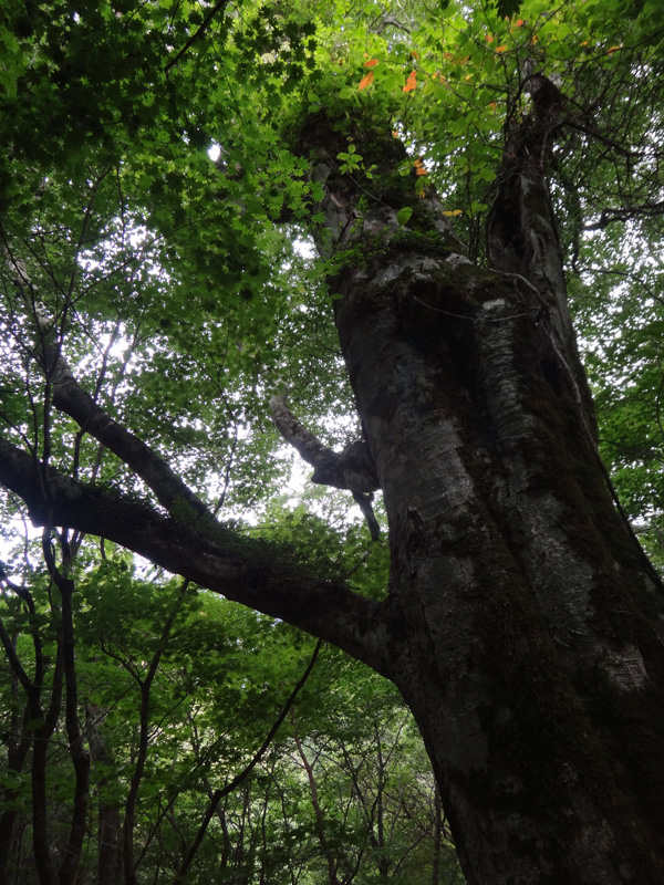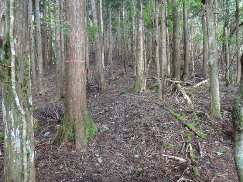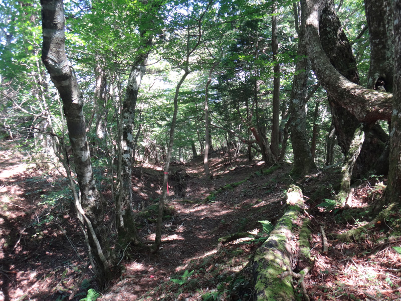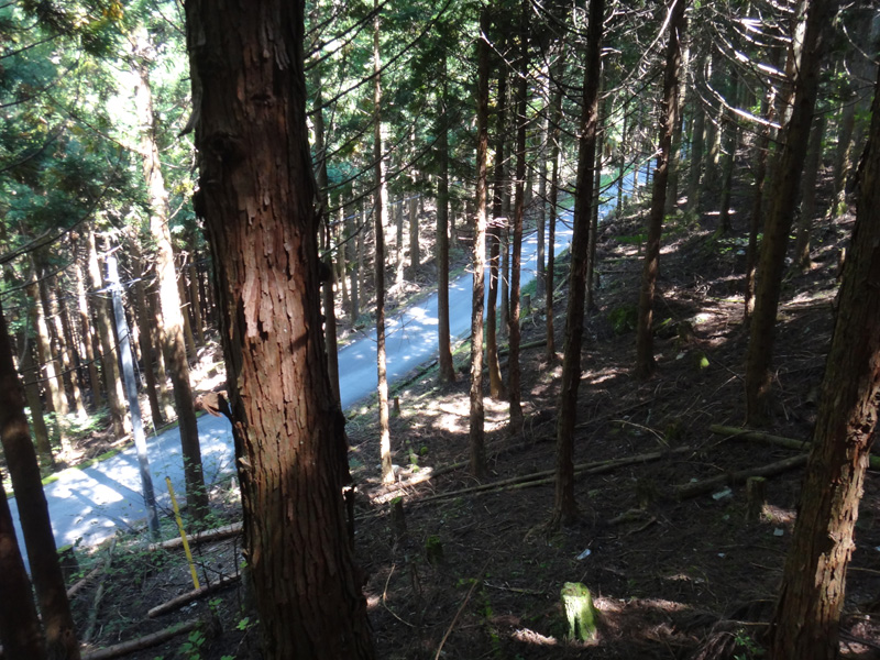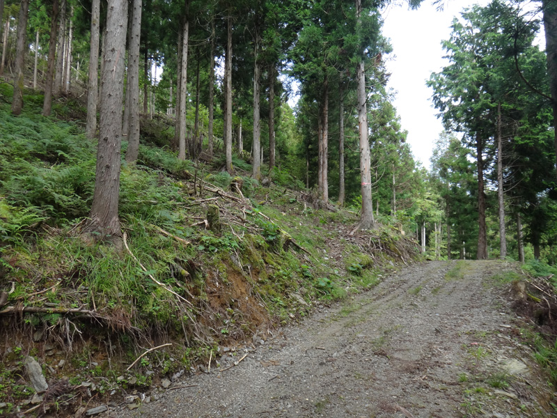 樹林帯の中を歩いていたのだけど、林道がこちらにも作られており、登山道を何度もまたいでいるような感じだった。 林道をまたぎながら登山道を進んでいく。