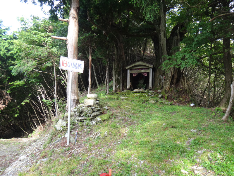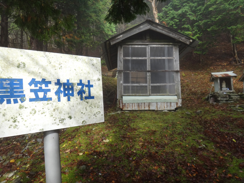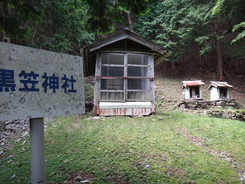 両脇を谷に囲まれた場所を真っ直ぐ上に登っていく。 この辺りの左側の斜面には雪が残っていた。 真っ直ぐ登る区間を終えて、すぐに「黒笠神社」に到着。