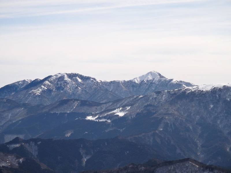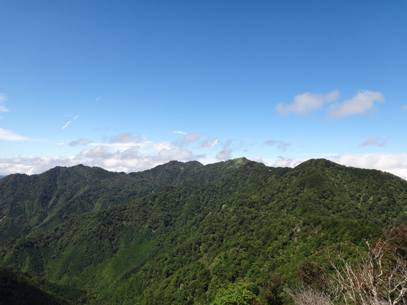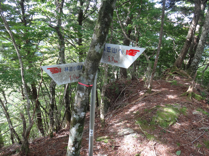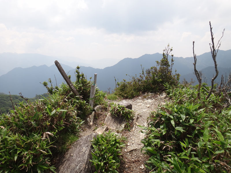 ここでも軽く水分補給をして、山頂を目指す。 山頂はもうすぐ。 少し歩くと、矢筈山方面への分岐が出現。 ここから矢筈山までは結構悪い道が続くので、オレの足でも2時間は越える。 見た目の距離は近いけど、意外に遠い矢筈山。