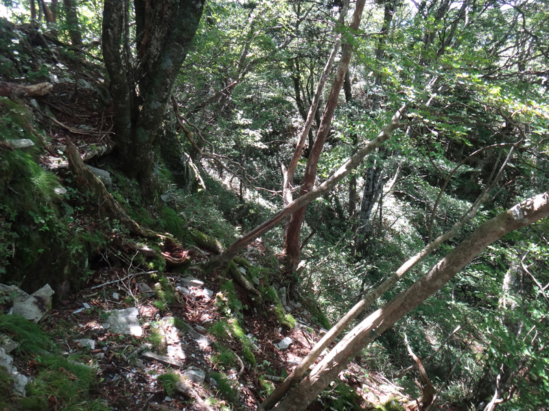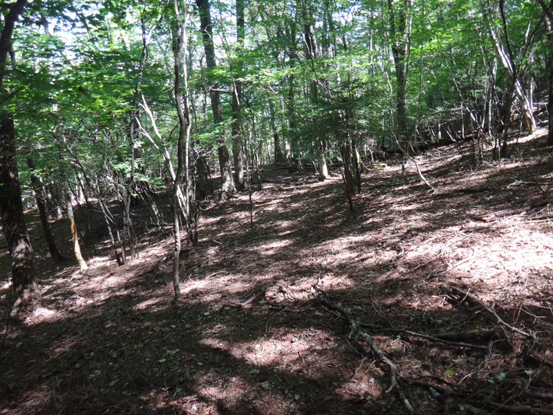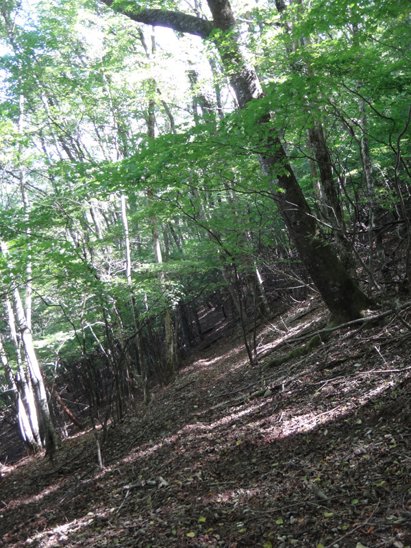 そして歩き出す。 ここから傾斜が少しきつくなり、沢に沿って斜面を歩くようになる。 そしていつも迷うポイントに到着。