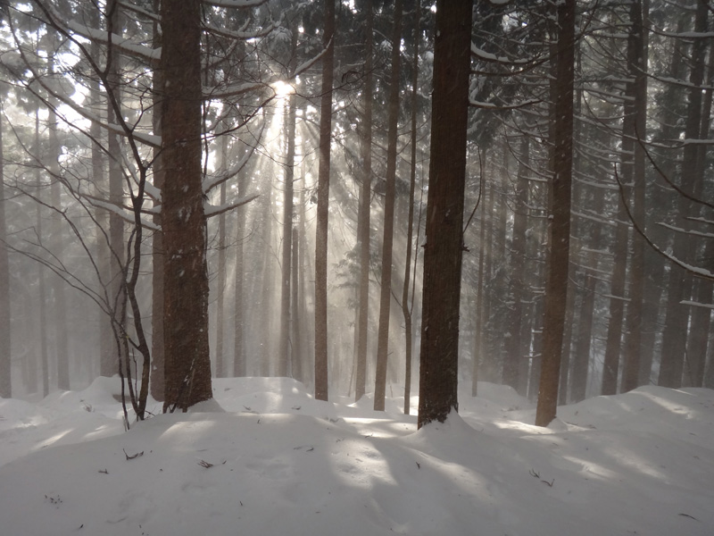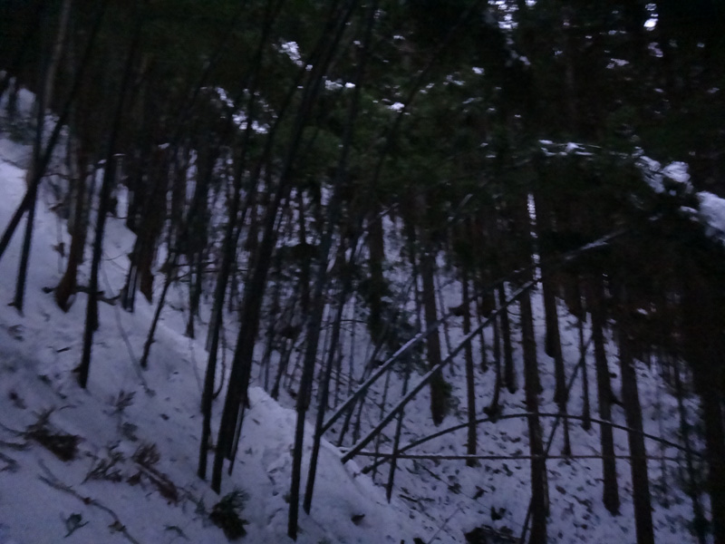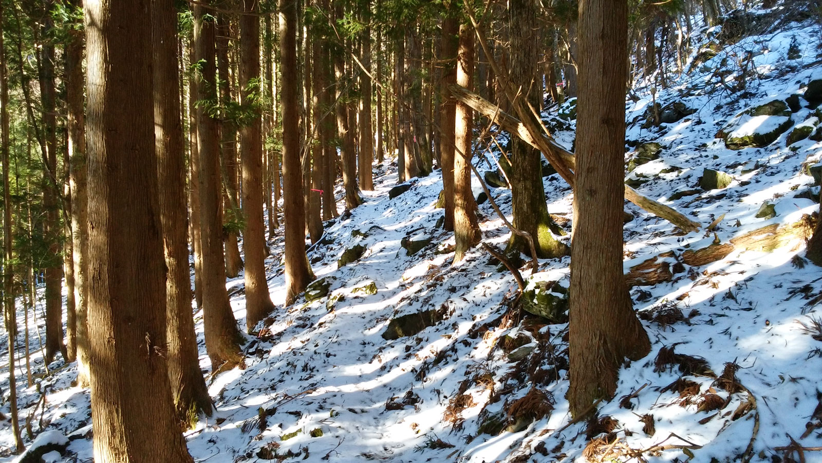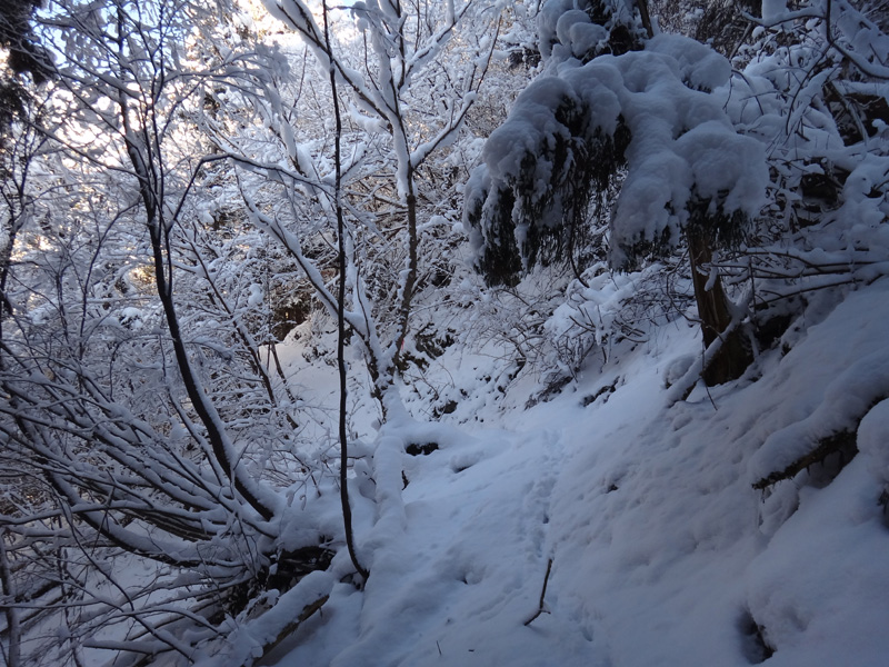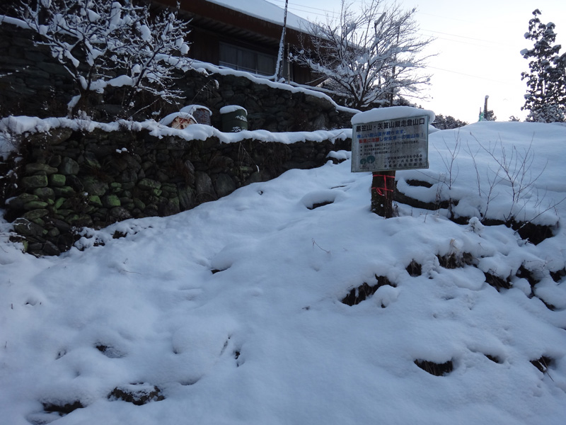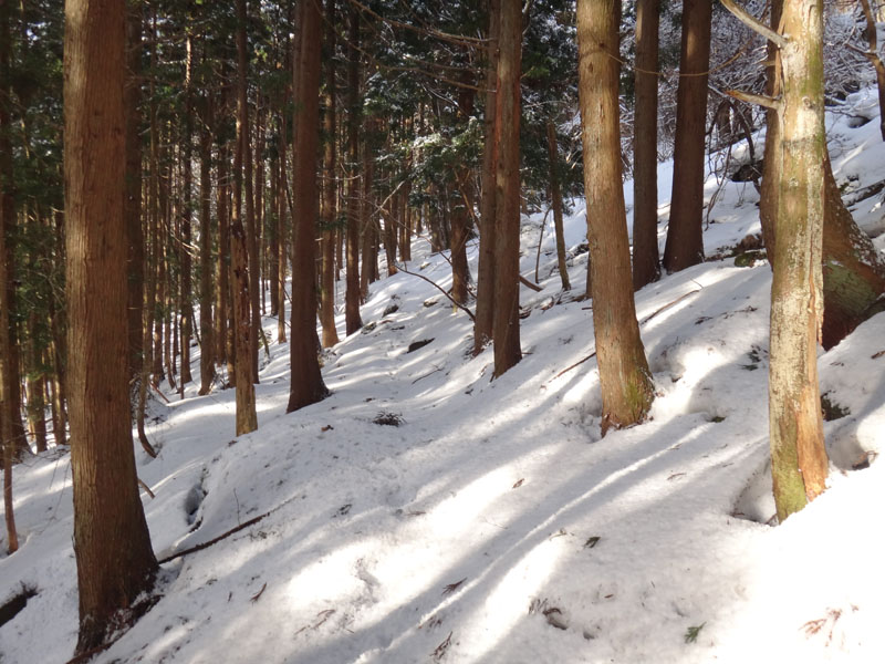 登山口から民家の脇を通り登山道へ。 造林帯の中を、いきなりの急傾斜が襲う。 この時点での積雪は10cm程度。 多少滑るが、雪自体は大した問題じゃないな、まだ。