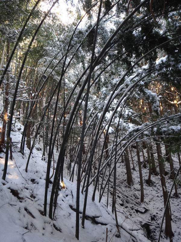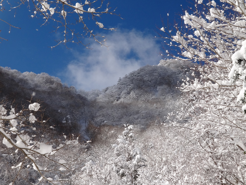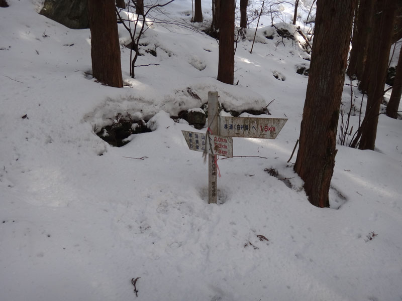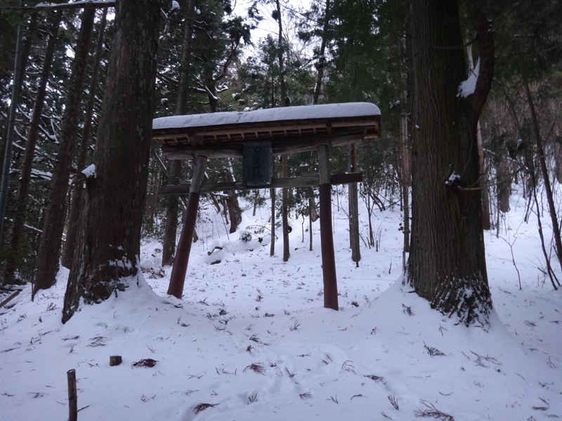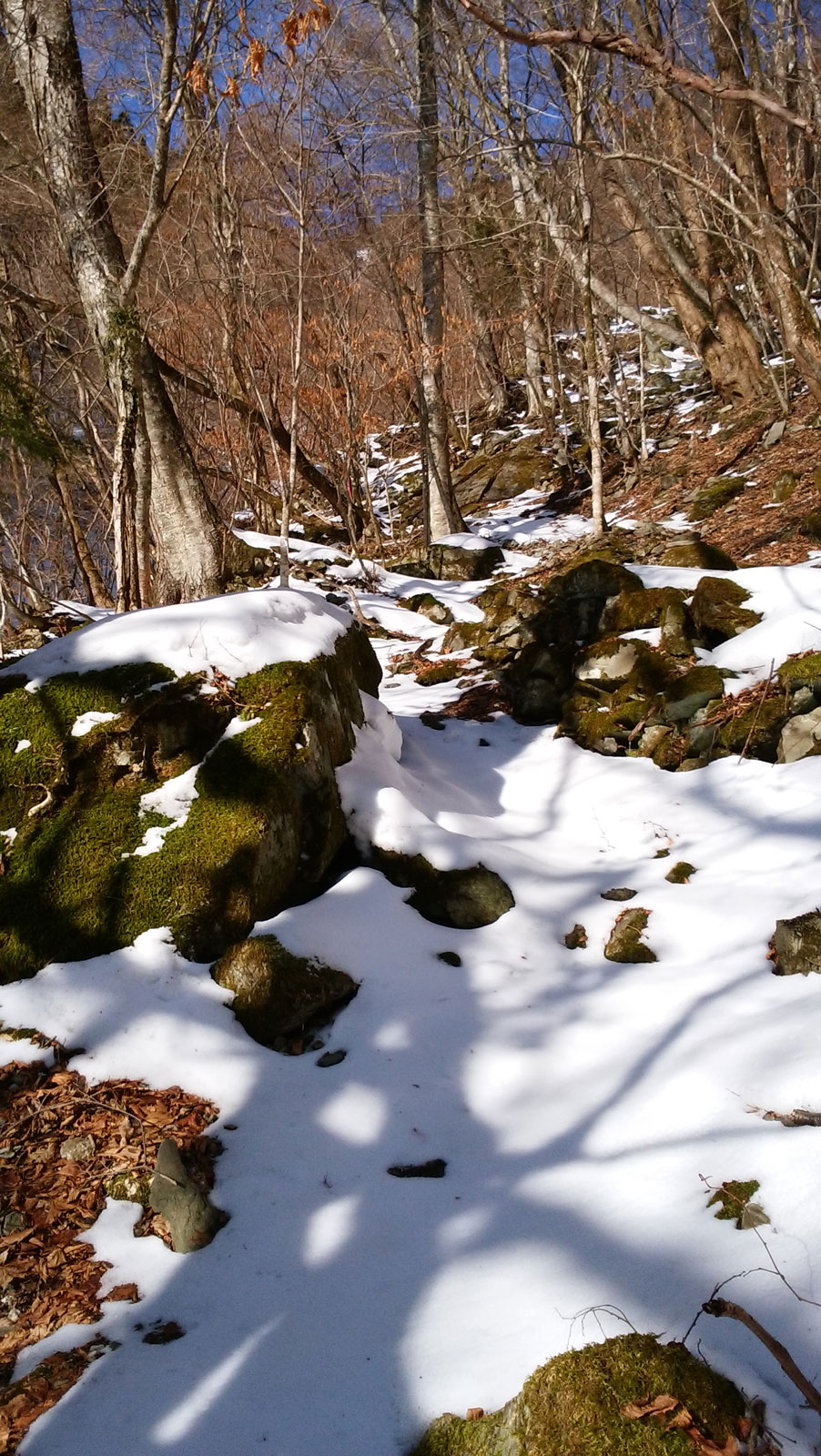 沢沿いの道を登っていく。 だんだんと積雪が多くなり、20~30cmくらいになる。 まだラッセルするというほどの積雪ではないが、足元が見えないのでとても滑る。 が、アイゼン付けるほどの場所でもないしなぁ。 ストックをうまく使いながら登っていく。 途中で一度水分補給を入れて、一気に黒笠神社まで歩く。
