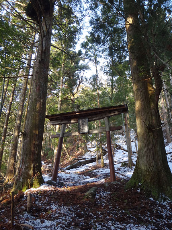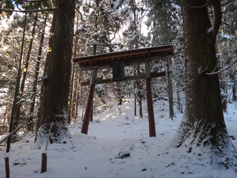 しばらく歩き、鳥居まで到着。 まだ積雪はなくて、ここまでの急登で汗が吹き出す。