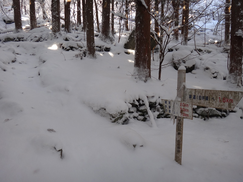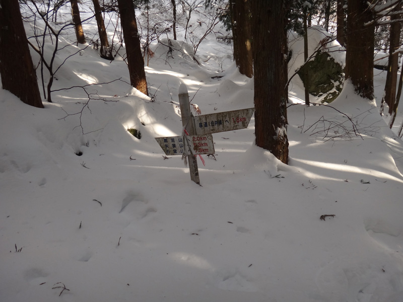 さて、下山しよう。 登って来る時苦労した急登ラッセル区間は、下りは超快適。 あっという間に山頂まで2kmの看板を通過し、鳥居まで降りてきてしまった。