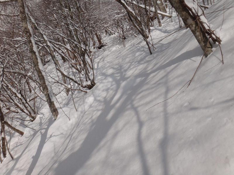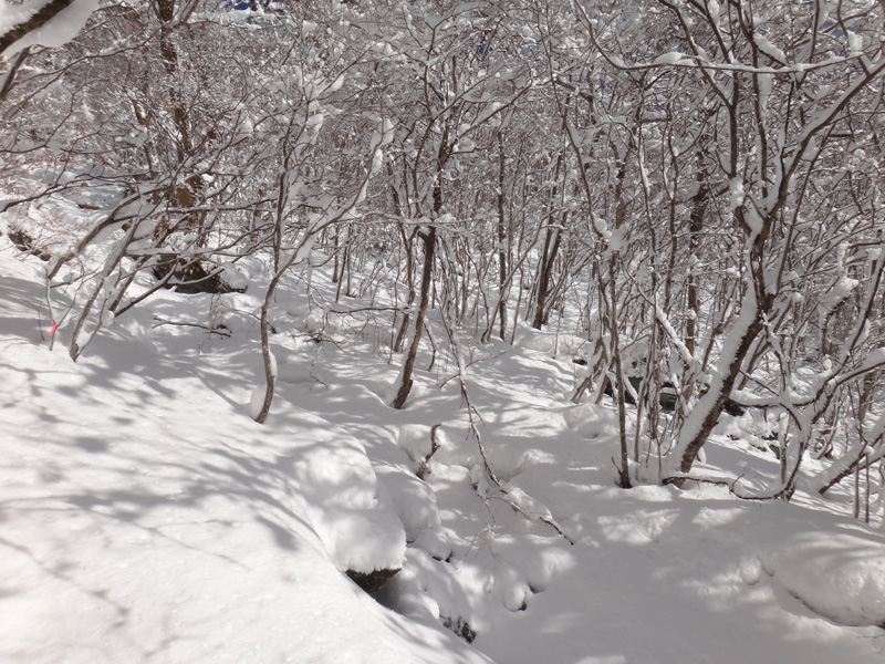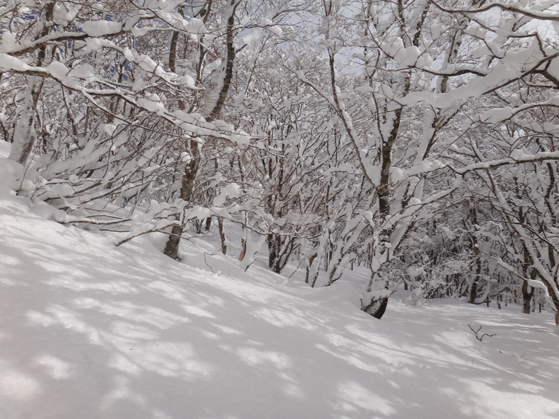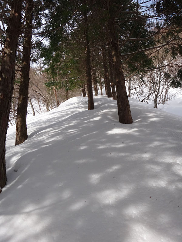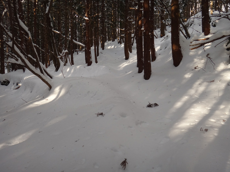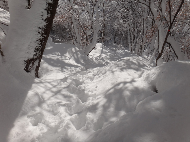ここから先は道がガラリと変わった。 まず傾斜がきつくなった。 造林帯ではなくなったので、積雪量がものすごい増えた。