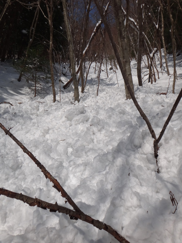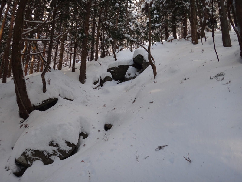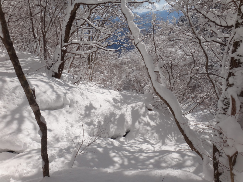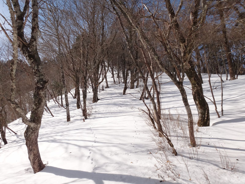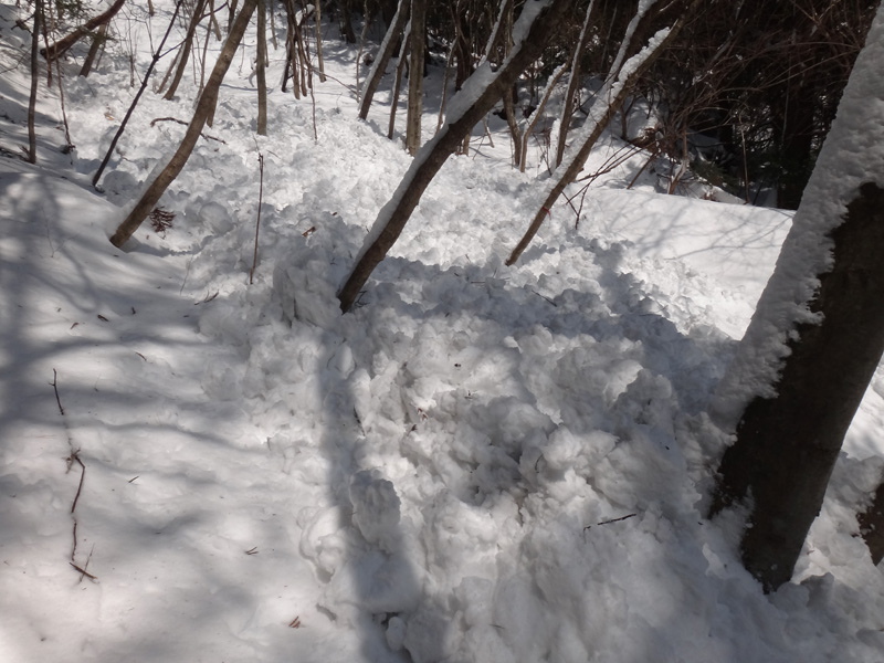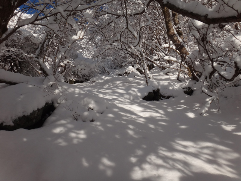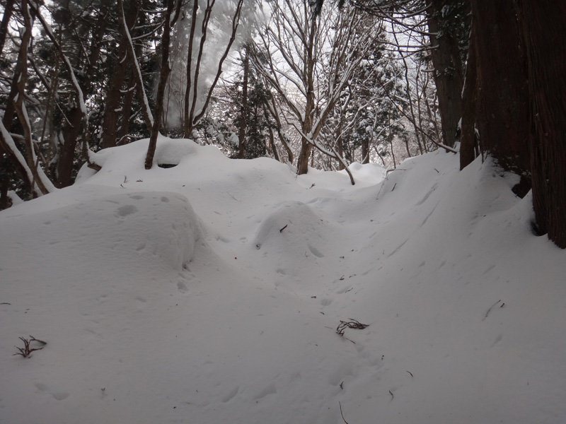 ここから先は道がガラリと変わった。 まず傾斜がきつくなった。 造林帯ではなくなったので、積雪量がものすごい増えた。