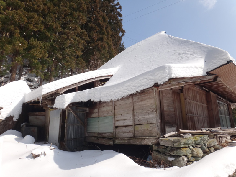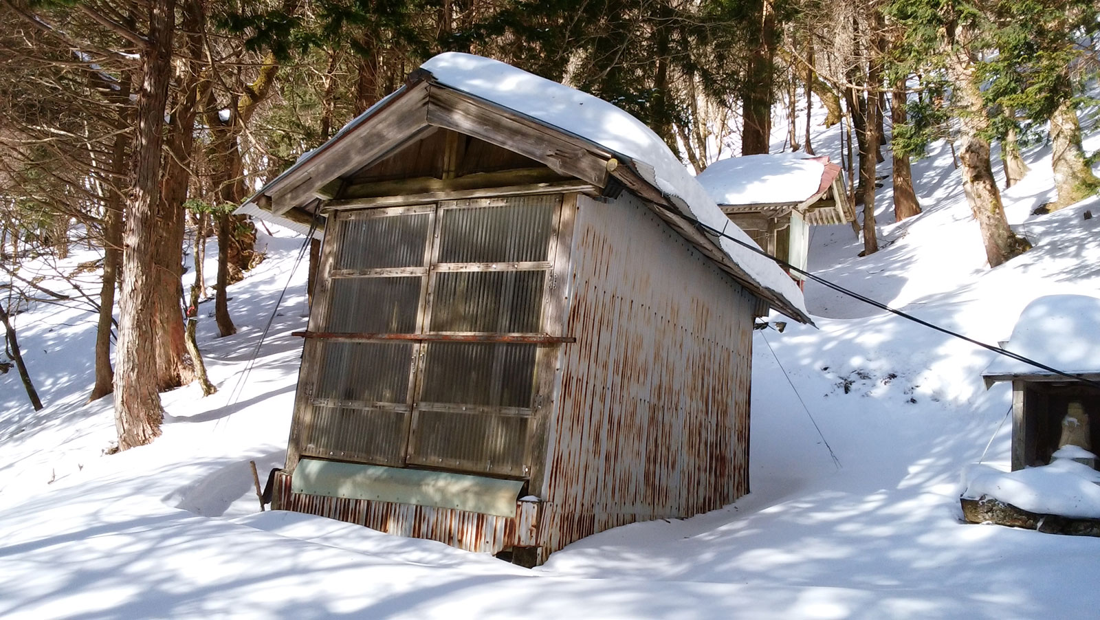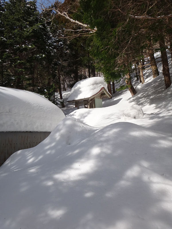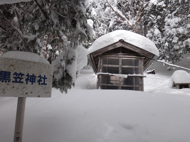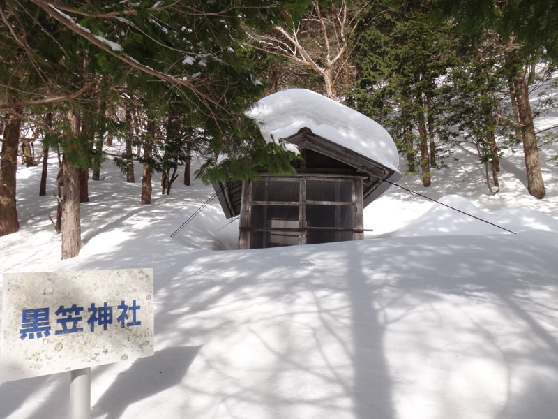途中で一度休憩を入れ、ようやく黒笠神社まで到着。 神社の屋根にはものすごい積雪が。 そして、先ほどの看板からここまで、無積雪期の倍の時間がかかった。