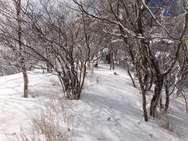 この辺りから積雪が30cm~になるが、膝まで埋まるほどの積雪ではないので、ペース自体は落ちるけれど、ラッセルらしいラッセルもせずに、矢筈山方面への分岐まで到着。