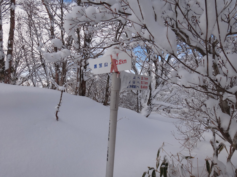 樹林帯の道を歩くこと30分ほど、黒笠山まであと2kmの看板まで到着。 このあたりで休憩しようか。 ここまでは無積雪期とほとんど変わらないペースで上がってくることができた。 この先は、トラヴァースしながら登って行くような感じの道だったと思う。