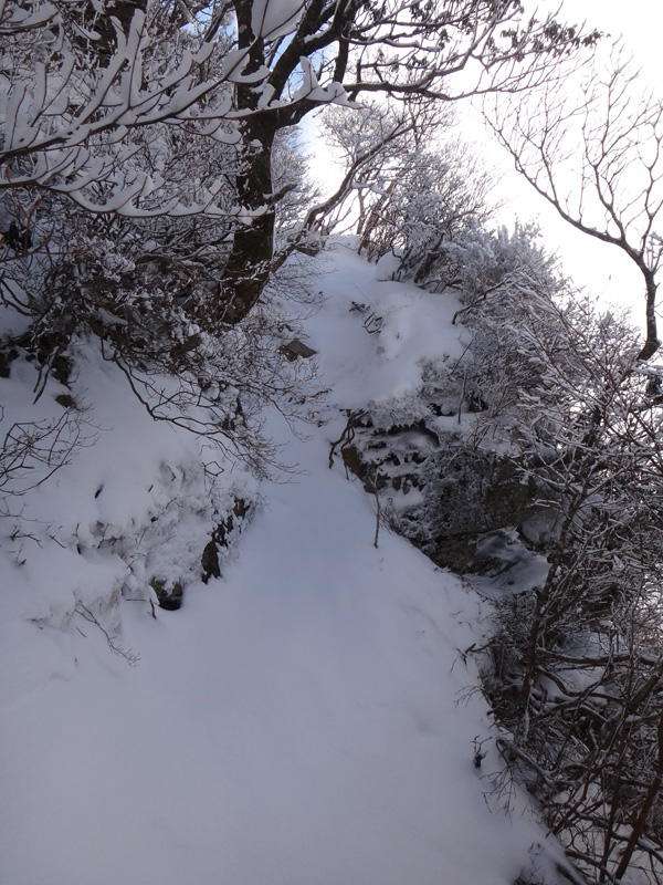 稜線まで這い上がった。 稜線に出たら、積雪の量は少し減ったかな。 ただ雪が硬くなって滑るようになった。 もうちょっとで山頂なので、アイゼンはまだ付けないで頑張ろう。