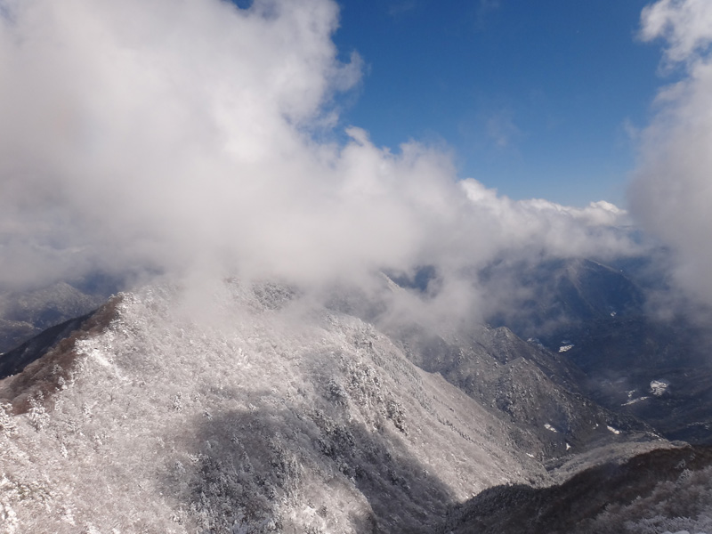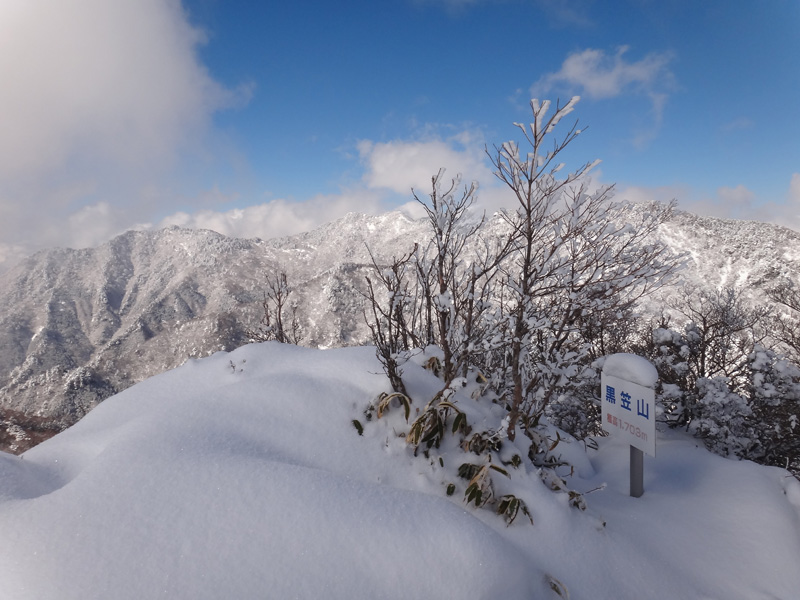 雪の区間を楽しんで、稜線に戻って、矢筈山分岐を越えて、ロープがかかっている場所を3箇所越えて、あっという間に黒笠山山頂に到着。