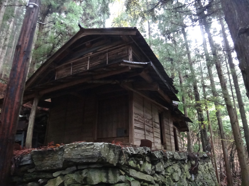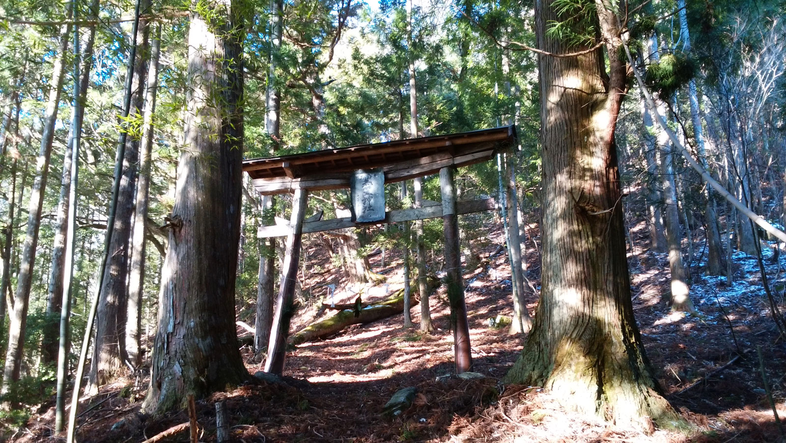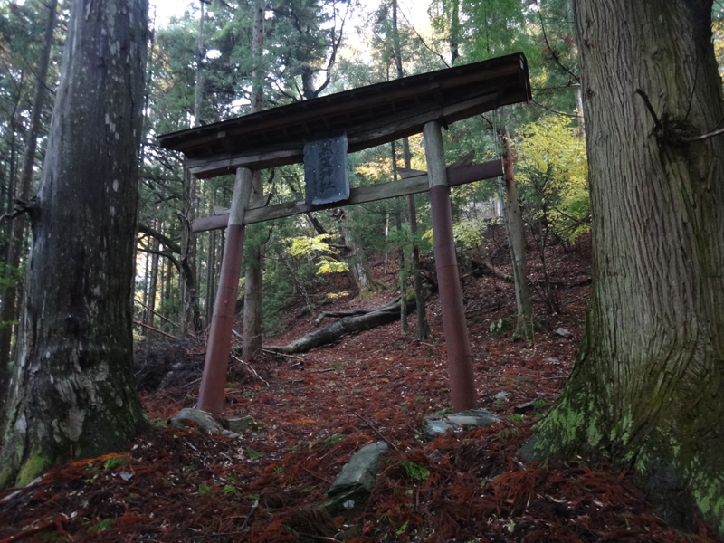 廃屋を越えて少し歩くと鳥居がある。 この鳥居の所に鹿威しがあったはずなのだが、跡形もなく無くなっていた。