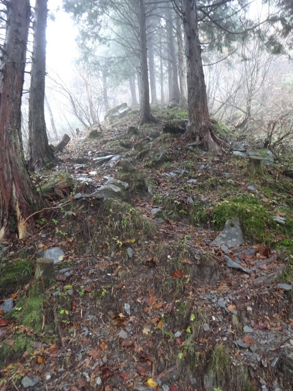枯れ沢みたいなところを通過したら、左は沢、右は枯れ沢のような地形を、一直線に上に登っていく道になる。 これを越えれば、黒笠神社はもうすぐだ。 じっくりと一歩一歩踏みしめて黒笠神社に到着。 思っていたよりだいぶ早くついたかな。 とりあえず山頂を目指そうか。