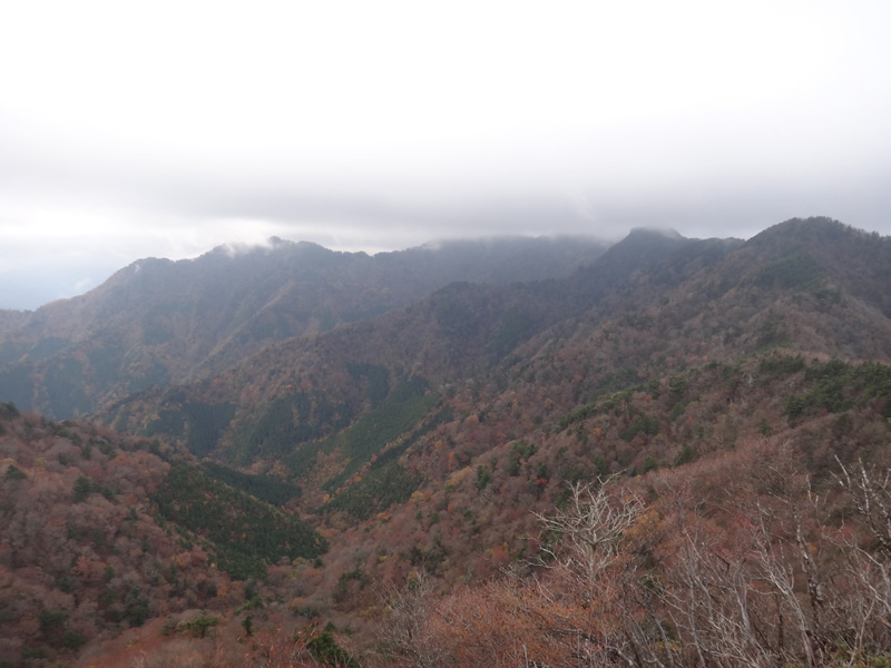 西方面は紅葉が綺麗だが、あいにくの天気。 矢筈山には雲がかかっている。