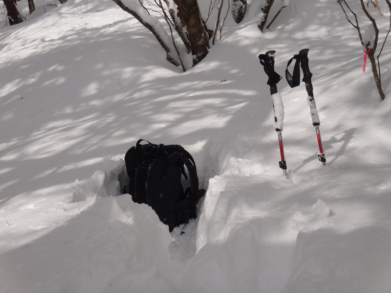 ここから先、雪が深くなることは間違いないので、ストックを出す。 久々に使ったストックは、1本のロックがおかしくなっており、長さを固定するのにかなり苦労した。