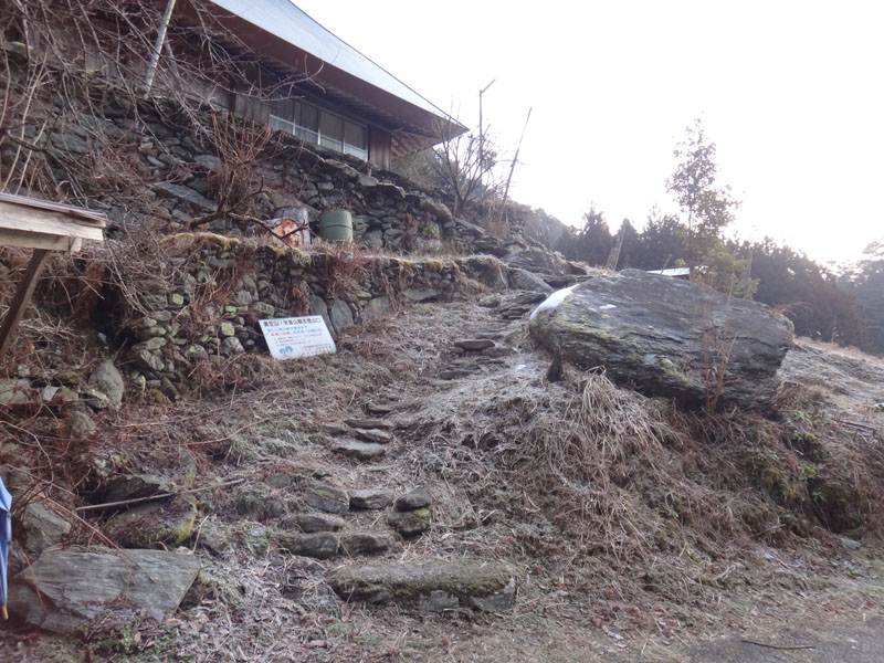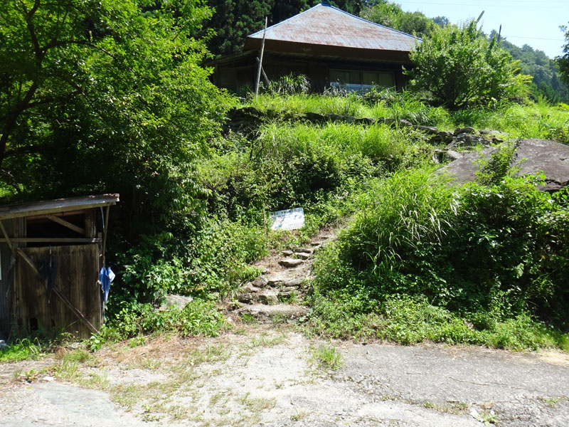 登山道を進んでいき、橋を渡ると一軒の民家がある。 この民家の脇から、山に向かって登山道は続いている。