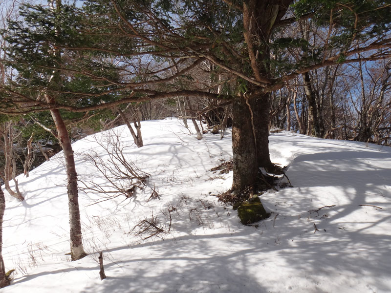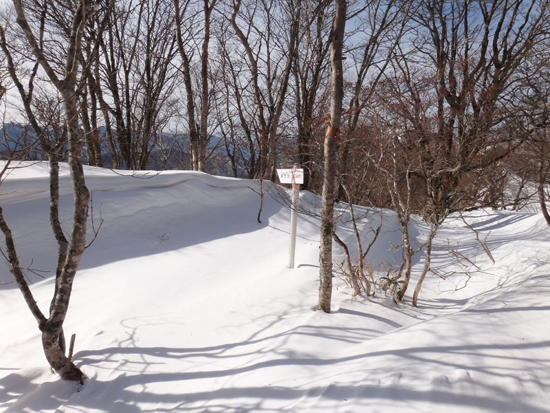 ここも写真だけ撮って素通り。 神社の裏を稜線に向かって歩き、すぐに稜線に到着した。 この稜線は少し道を外れると、雪の上を歩ける場所があったので、雪の上を歩いてきた。 と言っても、カチコチの雪で、もう汚くなっているけれど、気分は良い。
