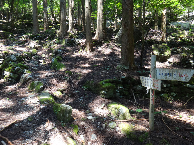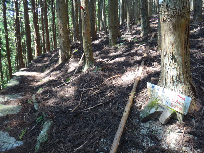 「山頂まで2km」の看板がある場所で少し休憩。 休憩後は暑くなるだろうから、フリースは脱ぐ。