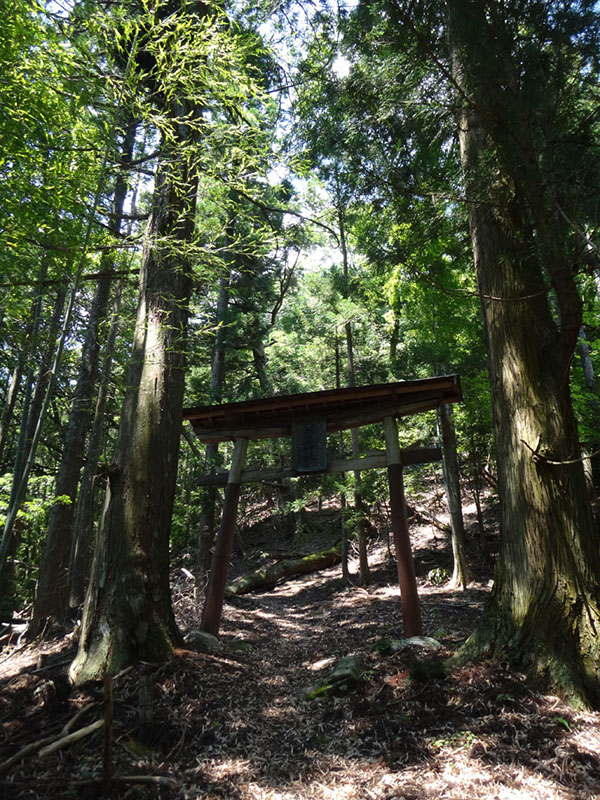 ここまで来たら黒笠神社は近い。 少し歩いて、谷と谷の間の尾根を一気に登って行く。 多分、黒笠山のこのルートの中で一番の急傾斜が続く場所。 この道を10分ほど登ったら、黒笠神社はもう目前。 すぐに神社まで到着。 さっき休んだばかりなので、そのまま稜線まで上がってしまおう。 稜線までもけっこうな道を歩いて、やっと稜線まで到着。