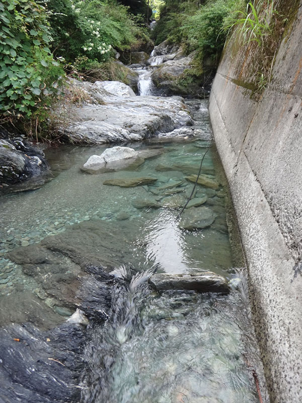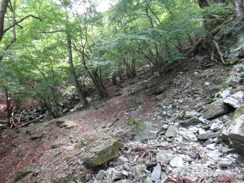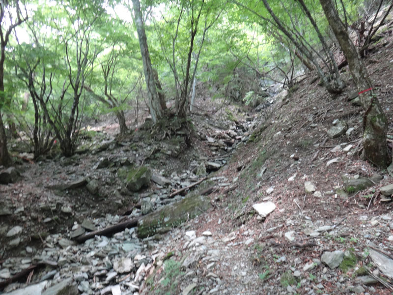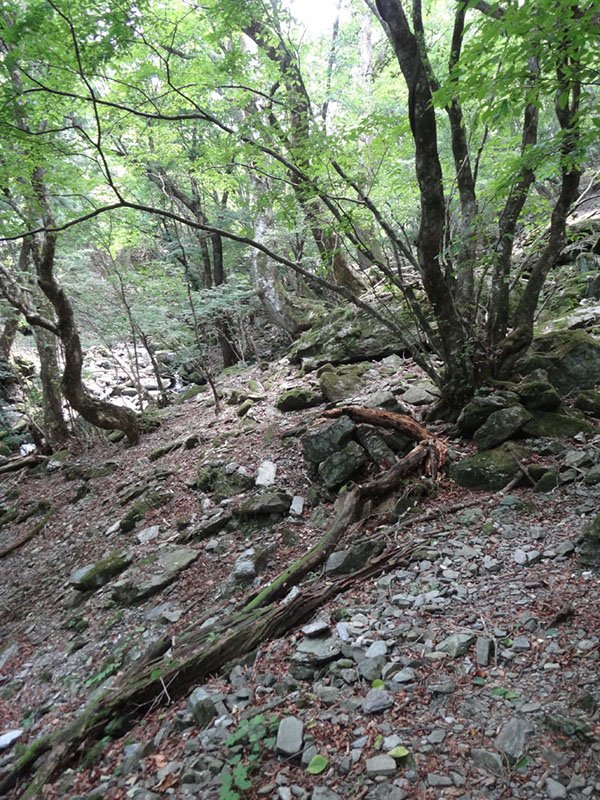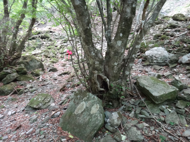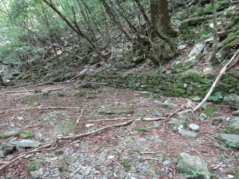 そんな道をどんどんと登っていく。 小さな支流を越えると、昔小屋が立っていたであろう、広いスペースのある場所があった。